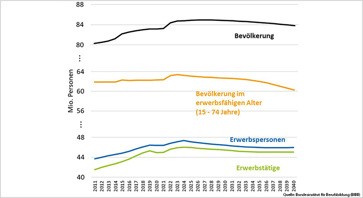 Die QuBe-Bevölkerungsprojektion zeigt in der achten Welle, dass die Bevölkerungszahl in den nächsten Jahren weiter steigen wird. Im Jahr 2024 steigt sie demnach auf 84,74 Millionen Personen an, sinkt jedoch bis auf 83,81 Millionen im Jahr 2040 ab. Dies ist insbesondere auf Zuwanderungen infolge des Krieges in der Ukraine zurückzuführen. Die erwerbsfähige Bevölkerung im Alter zwischen 15 und 74 Jahren geht dagegen im Prognosezeitraum stetig zurück und wird im Jahr 2040 ein Niveau von rund 60 Millionen Personen erreichen (vgl. Abbildung 1). Die Entwicklung der Erwerbspersonen folgt dieser Entwicklung und nimmt ebenfalls langfristig wieder ab. Der Rückgang wird allerdings weniger dramatisch sein, da davon ausgegangen wird, dass die Erwerbsbeteiligung in einigen Altersabschnitten sowohl bei Frauen wie bei Männern noch gesteigert werden kann. Im Jahr 2040 wird ein Niveau von 45,95 Millionen Erwerbspersonen erreicht. Auch die Arbeitsnachfrage sinkt langfristig. Während die Zahl der Erwerbstätigen in 2023 noch 45,93 Millionen beträgt, sinkt sie bis 2040 auf 45,02 Millionen ab. Die Unterbeschäftigung wird sich dadurch bis 2040 im Vergleich zum Niveau der 2000er Jahre deutlich reduzieren und nur noch rund 0,9 Millionen Personen entsprechen. Eine solche Reduktion der Erwerbslosigkeit kann aber nur erreicht werden, wenn der künftige Bedarf an Arbeitskräften nicht nur quantitativ, sondern auch qualifikatorisch gedeckt werden kann. Die Annäherung von Arbeitskräfteangebot und -nachfrage erhöht insgesamt die Chancen der Erwerbslosen bei der Jobsuche, birgt aber gleichzeitig die Gefahr eines Arbeits- bzw. Fachkräftemangels bei bestimmten Qualifikationen, Branchen oder Berufen.