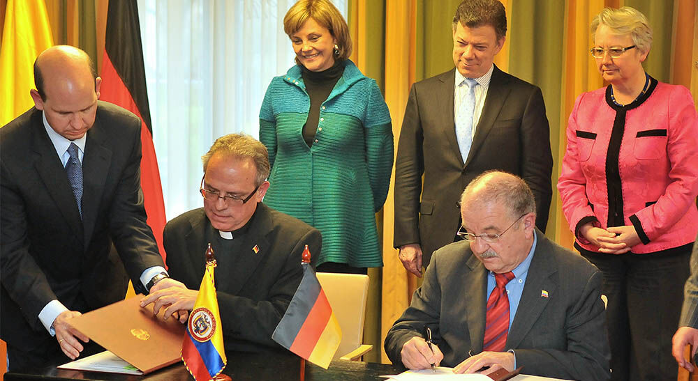 Kooperation in der beruflichen Bildung: SENA-Generaldirektor Bernal und BIBB-Präsident Kremer unterzeichnen im April 2011 einen Kooperationsvertrag in Anwesenheit des kolumbianischen Staatspräsidenten Santos und Bundesbildungsministerin Schavan