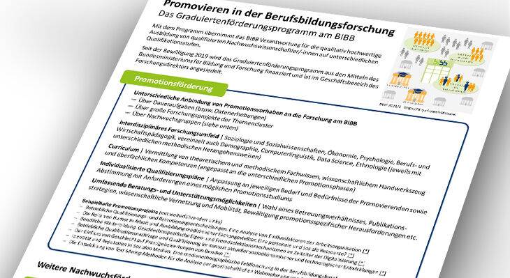 Mit seinem Graduiertenförderungsprogramm bietet das Bundesinstitut für Berufsbildung (BIBB) Doktorandinnen und Doktoranden und bereits promovierten Wissenschaftlerinnen und Wissenschaftlern die Möglichkeit, zu aktuellen und relevanten Themen der Berufsbildung zu forschen. Gleichzeitig werden sie durch ein umfassendes Qualifizierungs- und Beratungsangebot auf ein Berufsleben inner- oder außerhalb der hochschulischen Laufbahn vorbereitet.