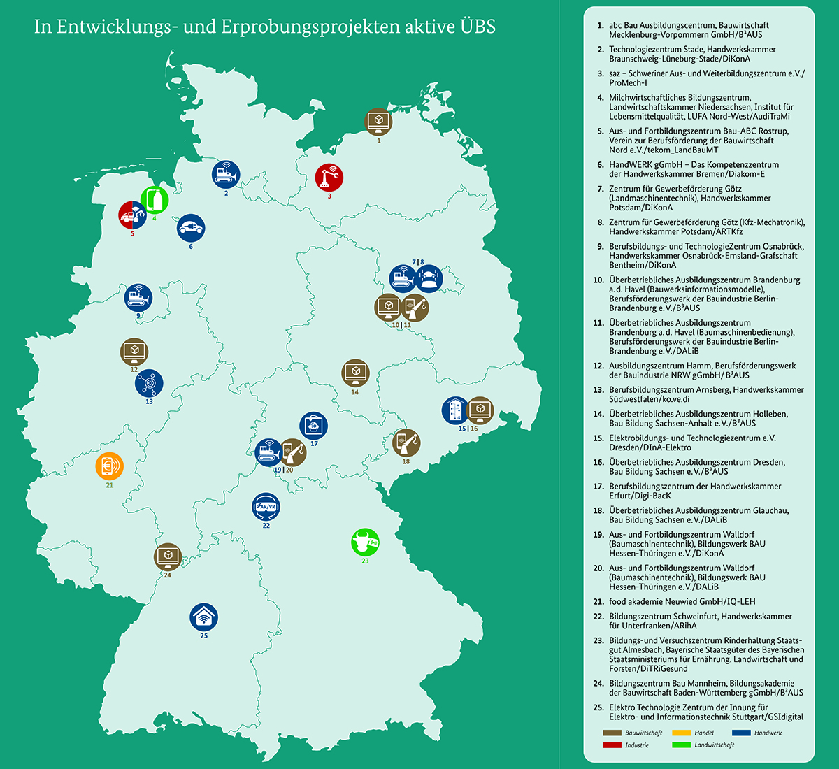 Viele ÜBS haben bereits die Fördermittel genutzt, um ihre Ausstattung zu modernisieren: Bis Mitte 2020 wurden an über 200 ÜBS-Standorten fast 40.000 Gegenstände angeschafft. Hinzu kommen acht Praxisbeispiele moderner Ausbildung aus den geförderten Entwicklungs- und Erprobungsprojekten.