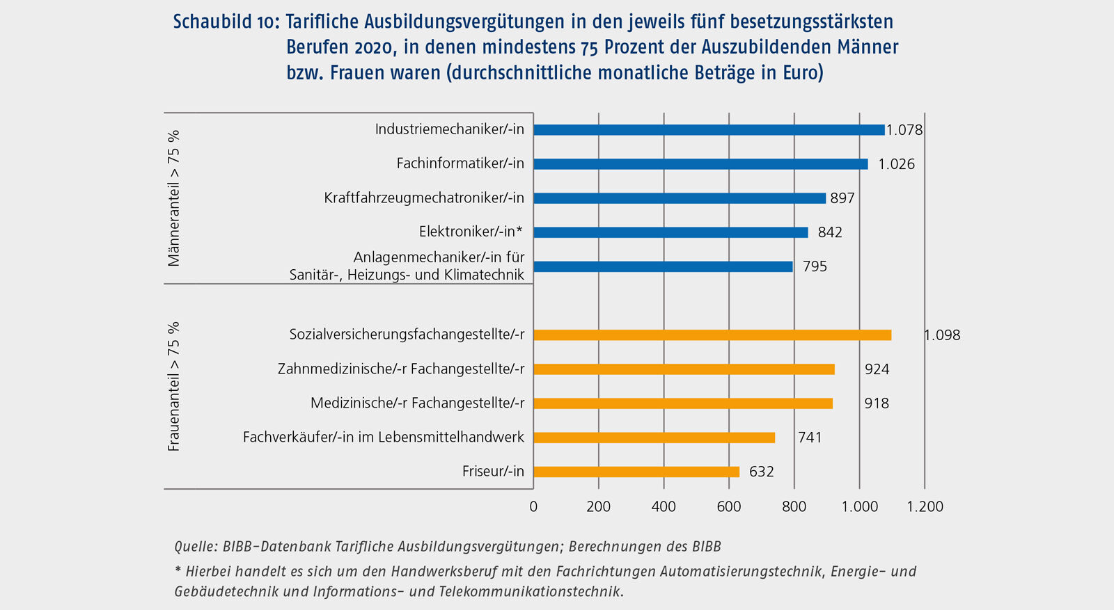 Die geschlechtsspezifischen Unterschiede kommen nicht aufgrund von ungleichen Vergütungen in den Tarifverträgen zustande, da hier grundsätzlich keine Unterschiede gemacht werden. Die abweichenden Vergütungsdurchschnitte erklären sich durch die gewählten Berufe. So lernen z. B. im Handwerksbereich viele Frauen den Beruf Friseur/-in, in dem die tarifliche Vergütung besonders niedrig ist. In Handwerksberufen mit besonders hohen Vergütungen wie beispielsweise Maurer/-in werden dagegen fast ausschließlich Männer ausgebildet. Andererseits gibt es auch Berufe mit hohen Vergütungen, in denen überwiegend Frauen ausgebildet werden, wie der Beruf Sozialversicherungsfachangestellte/-r und Berufe mit eher geringen Vergütungen, die fast ausschließlich Männer lernen. Ein Beispiel hierfür ist der Beruf Anlagenmechaniker/-in für Sanitär-, Heizungs- und Klimatechnik. Schaubild 10 verdeutlicht diese Bandbreite. Aufgeführt sind die jeweils besetzungsstärksten Ausbildungsberufe, in denen mindestens 75 Prozent der Auszubildenden Männer bzw. Frauen sind.