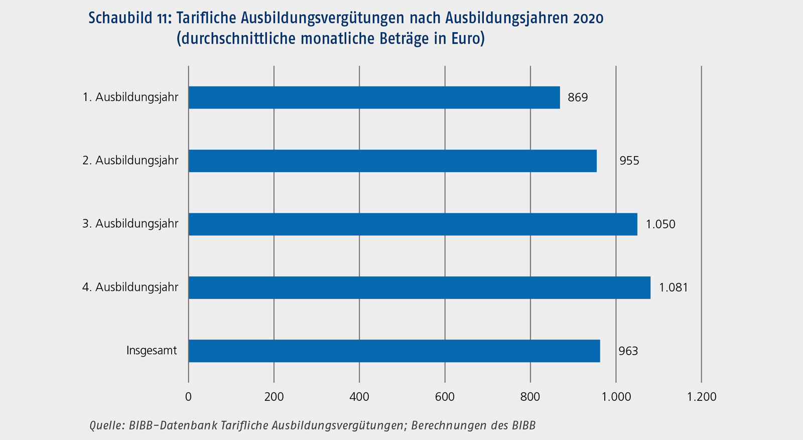 Bei allen bisher genannten Beträgen handelt es sich jeweils um die durchschnittlichen tariflichen Vergütungen während der gesamten in der Ausbildungsordnung festgelegten Ausbildungsdauer der Berufe. Schaubild 11 differenziert nun nach den einzelnen Ausbildungsjahren. Gesetzlich festgelegt ist eine mit jedem Ausbildungsjahr ansteigende Erhöhung der Ausbildungsvergütungen (§ 17 BBiG).
