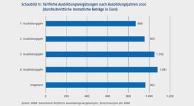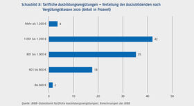 2020 wurde eine Mindestausbildungsvergütung eingeführt. Von der Mindestausbildungsvergütung ausgenommen sind allerdings tarifvertragliche Regelungen, sodass sie keinen direkten Einfluss auf die tariflichen Vereinbarungen hat. Dennoch wurden in einigen Tarifbereichen mit eher niedrigen Vergütungen Erhöhungen vereinbart. Der Anteil der Auszubildenden mit besonders niedrigen Ausbildungsvergütungen hat sich jedoch nicht verringert. Sowohl 2019 als auch 2020 erhielten zwei Prozent der Auszubildenden tarifliche Ausbildungsvergütungen von weniger als 600 €.