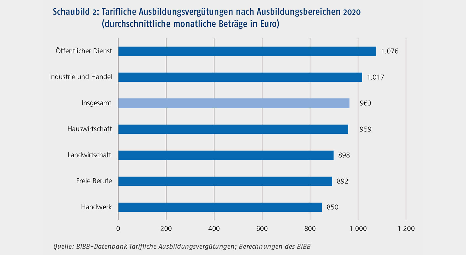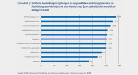 Vgl. www.bibb.de/ausbildungsverguetung für eine Gesamtübersicht über die für das Jahr 2020 ermittelten tariflichen Ausbildungsvergütungen nach Berufen für das Bundesgebiet sowie getrennt für West- und Ostdeutschland.