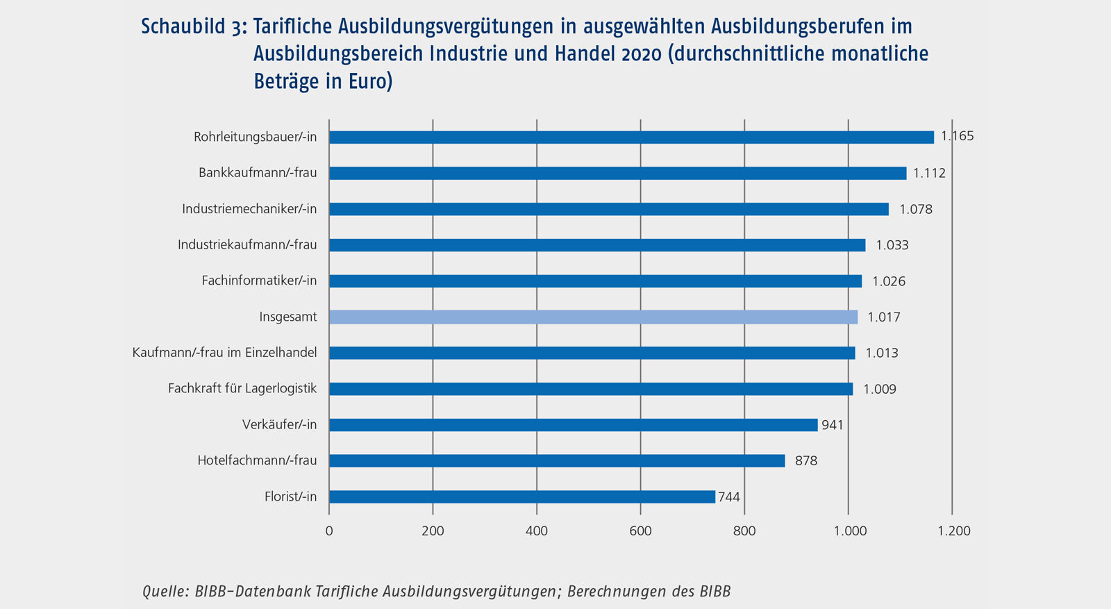 Schaubild 3 stellt die tariflichen Ausbildungsvergütungen für ausgewählte Berufe aus dem größten Ausbildungsbereich Industrie und Handel dar. Insgesamt zeigt sich bei den in Industrie und Handel ausgebildeten Berufen ein hohes Vergütungsniveau. In den meisten Berufen lagen die tariflichen Ausbildungsvergütungen über 1.000 €, nur bei etwas mehr als einem Drittel der Berufe darunter. Insbesondere Berufe aus dem Hotel- und Gaststättengewerbe, für die hier stellvertretend der Beruf Hotelfachmann/-frau aufgeführt ist, gehören zu dieser Gruppe, daneben auch einige kaufmännische Berufe wie Verkäufer/-in. Zugleich wurden aber auch in einigen kaufmännischen Berufe hohe Ausbildungsvergütungen gezahlt, z. B. im Beruf Bankkaufmann/-frau. Die insgesamt höchsten Vergütungen wurden im Beruf Rohrleitungsbauer/-in mit 1.165 € erzielt, die niedrigsten im Beruf Florist/-in mit 744 €.