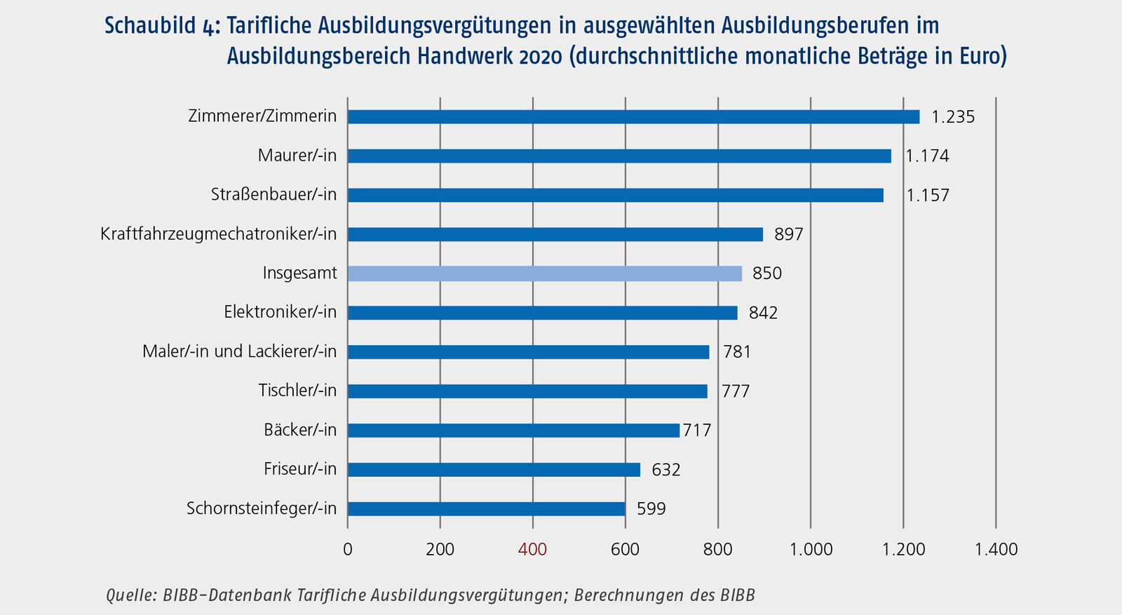 Dies sind im Handwerk die Berufe Beton- und Stahlbetonbauer/-in, Straßenbauer/-in, Stuckateur/-in, Fliesen-, Platten- und Mosaikleger/-in, Maurer/-in und Zimmerer/Zimmerin sowie in Industrie und Handel die Berufe Kaufmann/-frau für Versicherungen und Finanzen, Lacklaborant/-in, Bankkaufmann/-frau, Straßenbauer/-in und Rohrleitungsbauer/-in (vgl . auch die Berufetabellen unter https://www.bibb.de/ausbildungsverguetung).