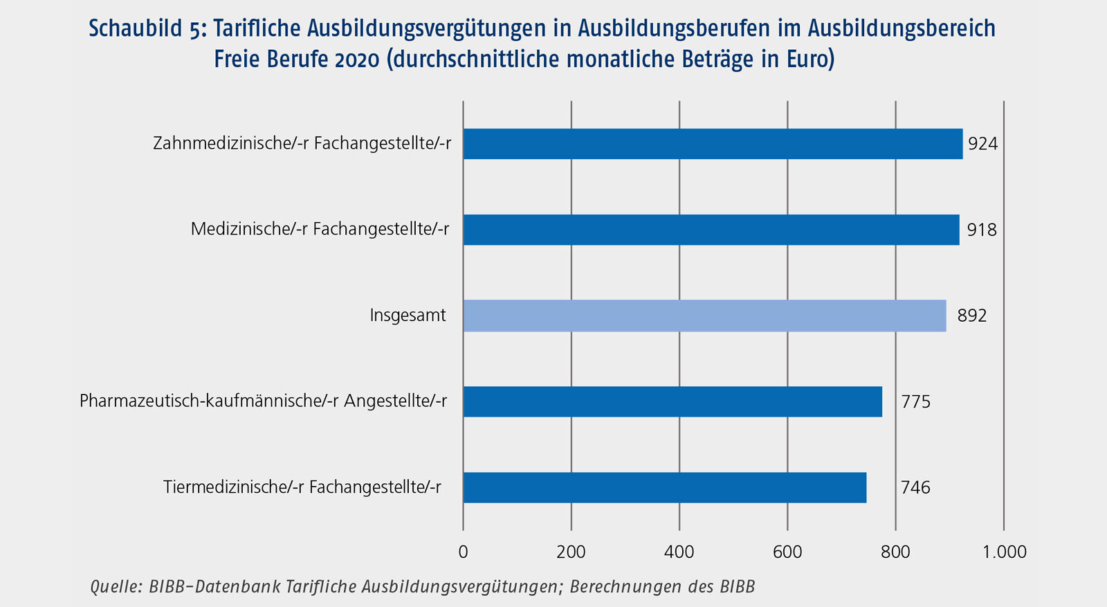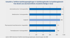 Im Ausbildungsbereich Freie Berufe liegen Daten für vier Berufe vor (vgl. Schaubild 5). Hier ist darauf hinzuweisen, dass in besetzungsstarken Berufen wie Rechtsanwaltsfachangestellte/r und Steuerfachangestellte/-r keine tariflichen Vereinbarungen geschlossen werden. Mit rund 920 € waren die tariflichen Ausbildungsvergütungen in den Berufen Zahnmedizinische/-r Fachangestellte/-r und Medizinische/-r Fachangestellte/-r fast gleich hoch. Die Ausbildungsvergütungen in den Berufen Pharmazeutisch-kaufmännische/-r Angestellte/-r und Tiermedizinische/-r Fachangestellte/-r fielen im Vergleich dazu deutlich ab.