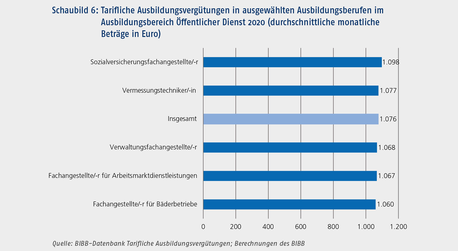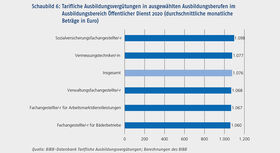 Bei den Berufen im Öffentlichen Dienst sind nur geringe Unterschiede festzustellen (vgl. Schaubild 6). Die Spannweite zwischen dem Beruf mit der niedrigsten und der höchsten durchschnittlichen tariflichen Ausbildungsvergütung lag 2020 bei lediglich 38 €. Im Öffentlichen Dienst finden vor allem die zwei Tarifverträge für die Länder sowie für den Bund und die Kommunen Anwendung. Sie unterscheiden sich in der Höhe der vereinbarten Ausbildungsvergütungen nur wenig. Die geringen Abstufungen ergeben sich daher aus der unterschiedlichen Verteilung der Auszubildenden auf Bund, Länder und Kommunen je nach Beruf. Im Öffentlichen Dienst erhielten 2020 alle Auszubildenden tarifliche Ausbildungsvergütungen von mehr als 1.000 €.