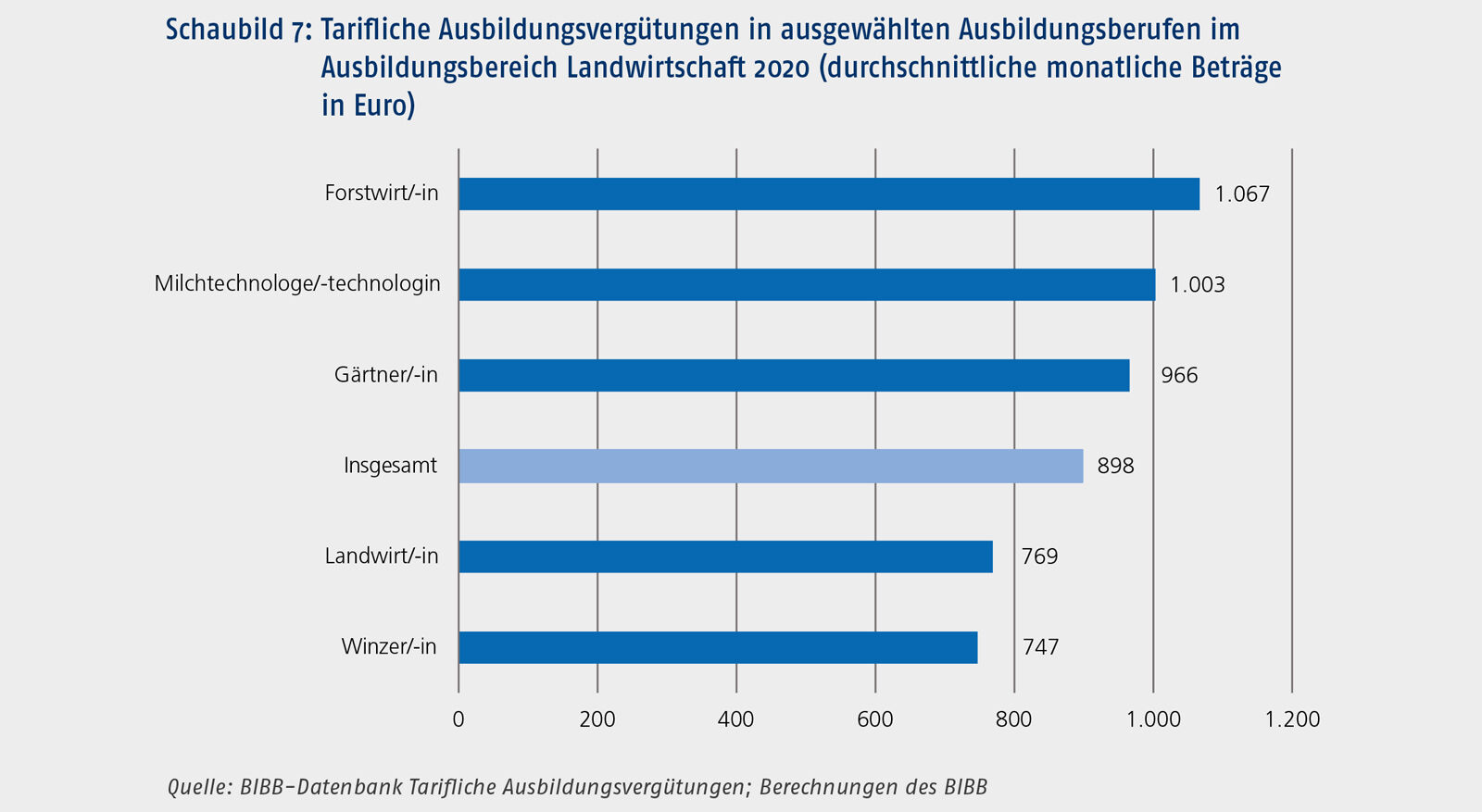 Im Ausbildungsbereich Landwirtschaft sind Auswertungen für neun Ausbildungsberufe möglich. Schaubild 7 stellt die Ergebnisse für fünf dieser Berufe dar. Hier ist eine Zweiteilung bei den tariflichen Ausbildungsvergütungen zu erkennen. Ein Teil der Berufe hatte 2020 tarifliche Ausbildungsvergütungen, die bei bzw. über dem gesamtdeutschen Durchschnitt von 963 € lagen. Beim Beruf Forstwirt/-in ist allerdings darauf hinzuweisen, dass ein erheblicher Teil der Auszubildenden bei Betrieben des Öffentlichen Diensts ausgebildet wird und dann dessen Tarifverträge Anwendung finden. In fünf der neun Berufe lagen die tariflichen Ausbildungsvergütungen unter 800 €. Im Durchschnitt am niedrigsten waren sie mit 747 € im Beruf Winzer/-in.