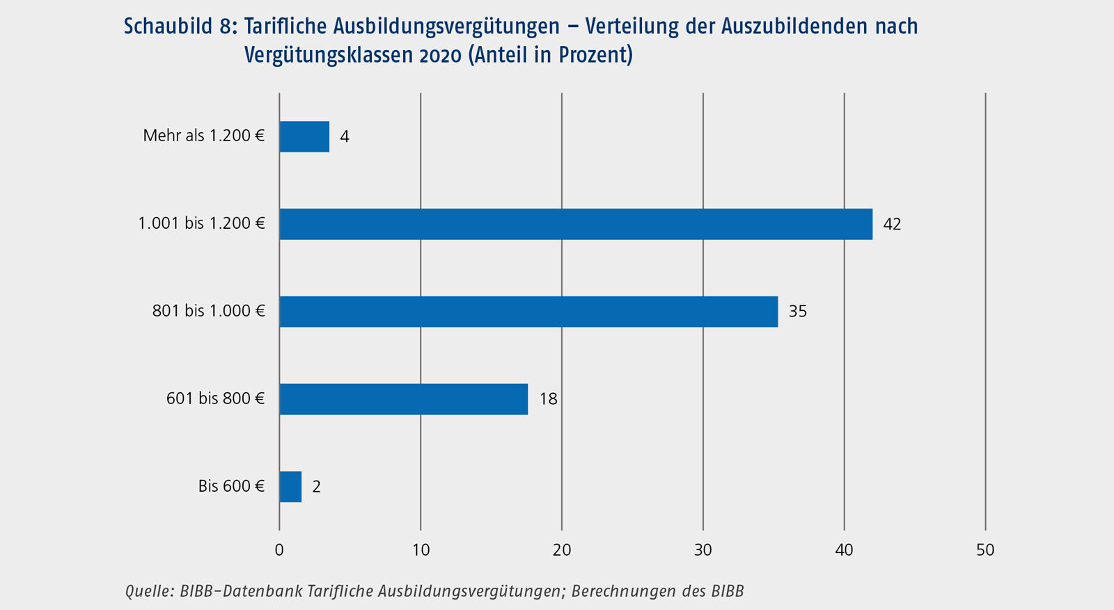 Wie bereits anhand der Auswertungen zu den Ausbildungsbereichen und -berufen deutlich wurde, wird ein erheblicher Teil der Auszubildenden in Deutschland in Berufen ausgebildet, in denen 2020 relativ hohe tarifliche Ausbildungsvergütungen gezahlt wurden. Rund 42 Prozent der Auszubildenden, die in einem tarifgebundenen Betrieb lernten, erhielten Vergütungen von mehr als 1.000 €, vier Prozent sogar mehr als 1.200 € (vgl. Schaubild 8). Für 35 Prozent der Auszubildenden bewegten sich die Vergütungen zwischen 801 bis 1.000 €. Eine vergleichsweise geringe Ausbildungsvergütung zwischen 601 bis 800 € erhielten 18 Prozent der Auszubildenden.