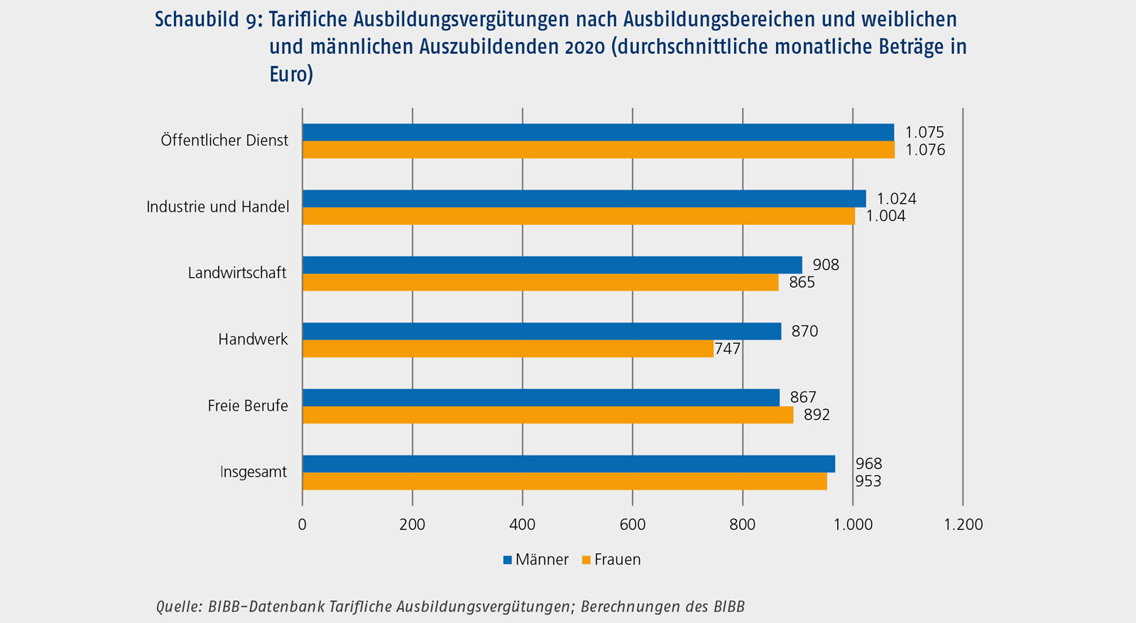 Männliche Auszubildende erhielten 2020 im Durchschnitt über alle Ausbildungsjahre mit 968 € leicht höhere tarifliche Ausbildungsvergütungen als weibliche Auszubildende mit 953 € (vgl. Schaubild 9). Die Differenz beträgt rund zwei Prozent und veränderte sich im Vergleich zum Jahr 2019 nicht. Nach Ausbildungsbereichen12 zeigen sich vor allem im Handwerk große Unterschiede. Die männlichen Auszubildenden kamen hier auf eine durchschnittliche tarifliche Ausbildungsvergütung von 870 €, die weiblichen Auszubildenden auf 747 €, was einer Differenz von 16 Prozent entspricht. Im Vergleich zu 2019 (vgl. Schönfeld/Wenzelmann 2020b) stiegen die tariflichen Ausbildungsvergütungen der männlichen Auszubildenden mit knapp vier Prozent stärker an als die der weiblichen Auszubildenden mit zwei Prozent, sodass sich der Abstand noch etwas vergrößerte. In der Landwirtschaft waren die tariflichen Ausbildungsvergütungen der männlichen Auszubildenden rund fünf Prozent höher als die der weiblichen Auszubildenden. Auch hier fielen die tariflichen Erhöhungen für männliche Auszubildende im Durchschnitt mit drei Prozent etwas höher aus als für weibliche Auszubildende mit zwei Prozent. Im Ausbildungsbereich Industrie und Handel waren die Unterschiede mit rund zwei Prozent relativ gering. Im Öffentlichen Dienst gab es keine geschlechtsspezifischen Unterschiede. In den Freien Berufen lag der ermittelte Durchschnittswert für Männer mit 867 € unter dem der Frauen mit 892 €.