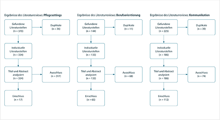 Die Ergebnisse aus dem systematischen Literaturreview liegen bereits vor. Unter Berücksichtigung aller Ein- und Ausschlusskriterien konnten 17 Quellen für den Themenbereich „Pflegesettings“ indirekt verwertet werden. Für den Themenbereich „Berufsorientierung“ wurden 52 Literaturquellen identifiziert. Der größte Verwertungsanteil wurde im Kontext der „Kommunikationswissenschaft“ sichtbar. Hier wurden 112 relevante Quellen recherchiert. Die Ergebnisse der bundesweiten Erhebung zur Spezifizierung der Pflegesettings als ein möglicher Orientierungsrahmen für die Beschreibung der Berufsattraktivität werden für die zweite Jahreshälfte 2022 erwartet.