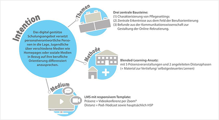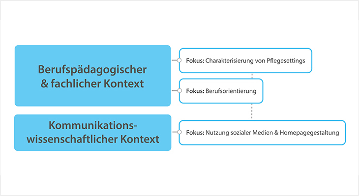 Die Inhalte des WBTs beziehen sich auf die Charakterisierung der Pflegesettings, auf ausgewählte Themenfelder der Berufsorientierung und auf kommunikationswissenschaftliche Erkenntnisse zur Planung und Durchführung digital gestützter Rekrutierungsstrategien. Die Fokussierung der Pflegesettings ist für die authentische Darstellung des Pflegeberufs und die Förderung der Berufsattraktivität hilfreich. Die authentische und realistische Darstellung des Berufs kann dazu beitragen, dass die Erwartungen und die späteren Erfahrungen während der Ausbildung nicht zu stark divergieren. Der Rekurs auf die Berufsorientierung ist obligatorisch, da Kenntnisse der personalverantwortlichen Personen über die Berufswahlkompetenz ihrer Zielgruppe entscheidend für die Ansprache der Ausbildungsinteressierten sein können. Des Weiteren ist für die Gestaltung von Homepages nicht nur die Platzierung der Berufs- und Bewerbungsinformationen auf der Homepage wichtig, sondern auch die Darstellungsform der aufgefundenen Inhalte. Die Forschungsbefunde hierzu werden ebenfalls in das WBT eingebunden.