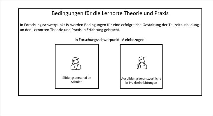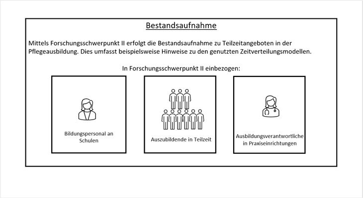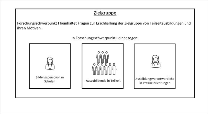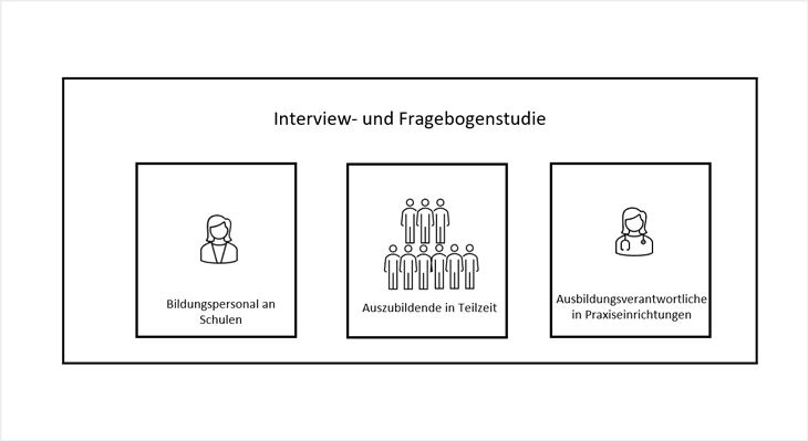 Im Projekt werden verschiedene Personengruppen befragt: Leitungspersonen bzw. Ausbildungsverantwortliche in Bildungseinrichtungen, Personen, die eine Teilzeitausbildung absolvieren oder absolviert haben sowie Ausbildungsverantwortliche in Pflegeeinrichtungen. Bei der Interviewstudie liegt der Fokus auf den Erfahrungswerten und Interessenlagen im Hinblick auf Teilzeitausbildungen. Die Fragebogenstudie verfolgt das Ziel, die Umsetzungsparameter sowie die Bedarfe der beteiligten Personengruppen zu eruieren. Im Fokus stehen auch hier Bildungseinrichtungen, Praxiseinrichtungen und (potenzielle) Teilzeitauszubildende, die zu unterschiedlichen inhaltlichen Schwerpunkten befragt werden. Die Befragung richtet sich zunächst jeweils an alle Personen, unabhängig davon, ob eine Teilzeitausbildung angeboten bzw. genutzt wird oder nicht. Dadurch können sowohl förderliche als auch hemmende Faktoren sowie ergänzende Unterstützungsbedarfe bei der Etablierung von Teilzeitausbildungsangeboten in Erfahrung gebracht werden.