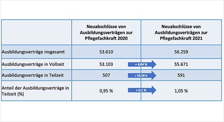 Beim Vergleich der Statistik der Pflegeberufe-Ausbildungsfinanzierungsverordnung für die Jahre 2020 und 2021 zeigt sich eine Zunahme der neu abgeschlossenen Ausbildungsverträge in Voll- und Teilzeit.