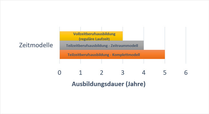 In § 6 Abs. 1 des Pflegeberufegesetzes wird die Möglichkeit zur Teilzeitberufsausbildung zur Pflegefachfrau bzw. zum Pflegefachmann festgelegt. In einer Vollzeitausbildung beträgt die Ausbildungsdauer drei Jahre. In Teilzeit darf die Ausbildungsdauer fünf Jahre nicht überschreiten. Wie die zeitliche Ausgestaltung der Teilzeitausbildung erfolgt, ist gesetzlich nicht vorgegeben (vgl. PflBG 2020). Für die dualen Ausbildungsberufe nach BBiG und HwO sind zwei Teilzeitmodelle bekannt: Das Zeitraummodell, bei dem einzelne Zeitabschnitte verkürzt werden und das Komplettmodell, bei dem die tägliche Arbeitszeit über die gesamte Ausbildungsdauer gekürzt wird. Bei beiden Teilzeitmodellen verlängert sich die Ausbildungsdauer entsprechend der anteilig reduzierten Arbeitszeit (vgl. BMBF 2021, S. 11; Baldus 2020, S. 50f.).