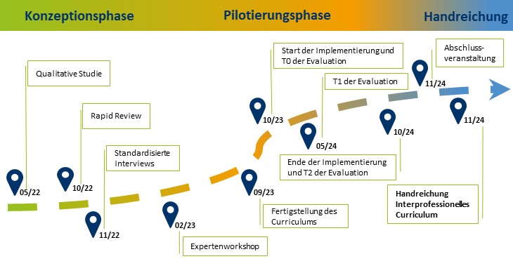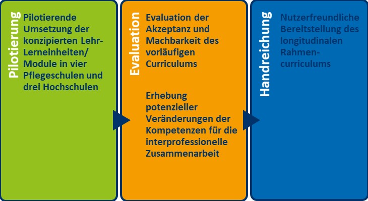 Ziel des Projektes ist die theoretisch und empirisch fundierte Entwicklung sowie anschließende Pilotierung eines longitudinalen Curriculums für die Ausbildung von Kompetenzen für die interprofessionelle Zusammenarbeit im Rahmen der beruflichen und hochschulischen Pflegeausbildung. Das Curriculum soll als Kerncurriculum flexibel unter verschiedenen Ausbildungsbedingungen einsetzbar sein, also unabhängig von der Anzahl der Ausbildungsplätze vor Ort, dem Ausbildungsniveau und der Art der angebotenen Berufsabschlüsse, sowie der Art und der Anzahl kooperierender Ausbildungsträger und der Verfügbarkeit von Kooperationen mit Ausbildungseinrichtungen für andere patientennahe Gesundheitsberufe.