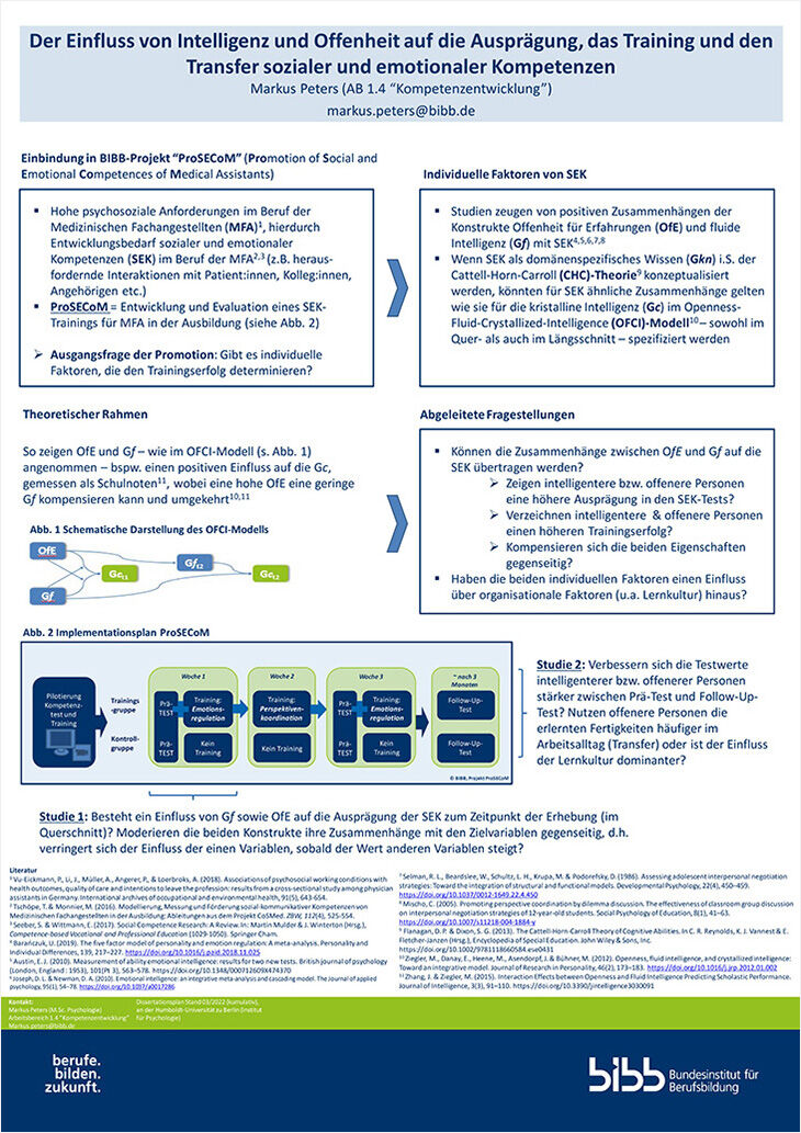 Beim Beruf der bzw. des Medizinischen Fachangestellten (MFA) handelt es sich um einen der am häufigsten gewählten Ausbildungsberufe in Deutschland. Dabei haben MFA in vielen Haus- und Facharztpraxen häufig eine zentrale Mittlerrolle zwischen Patient/-innen und Vorgesetzten, wodurch mit diesem Beruf hohe psychosoziale Anforderungen verbunden sind. Damit MFA diesen Anforderungen kompetent begegnen können, bedarf es einer ganzen Reihe sozialer und emotionaler Kompetenzen. Emotionsregulation, Perspektivenkoordination und Kommunikationsstrategien nehmen dabei eine zentrale Rolle für das Berufsbild ein, wie Erkenntnisse aus dem Projekt CoSMed zeigen. Während eine kompetente Emotionsregulation den angemessenen Umgang mit den eigenen Emotionen ermöglicht, behalten Menschen mit einer gut ausgeprägten Perspektivenkoordination in schwierigen sozialen Situationen sowohl die eigene Perspektive als auch die des Gegenübers im Blick und können diese in konstruktiver Weise in Beziehung zueinander setzen. Kompetente Kommunikationsstrategien zeigen sich darin, dass MFA in schwierigen Gesprächssituationen die Kommunikation auf eine für beide Seiten gute Lösung hinsteuern können. In dem Projekt wurde darüber hinaus Entwicklungsbedarf bzgl. dieser Kompetenzen festgestellt, weshalb nun im Anschluss in einem aktuellen BIBB-Projekt (ProSECoM) ein digitales Training zur Förderung eben dieser Kompetenzen entwickelt und evaluiert werden soll. Eine besondere Relevanz hat in dem Projekt nicht nur die Evaluation der Wirksamkeit des Trainings an sich, sondern auch die Identifikation individueller und organisationaler Faktoren, die den Effekt des Trainings beeinflussen. In diesem Promotionsprojekt wird dabei der Fokus auf die individuellen Faktoren gelegt; es wird untersucht, wie sie den Trainingserfolg beeinflussen und wie sie mit den Kompetenzen generell im Zusammenhang stehen.