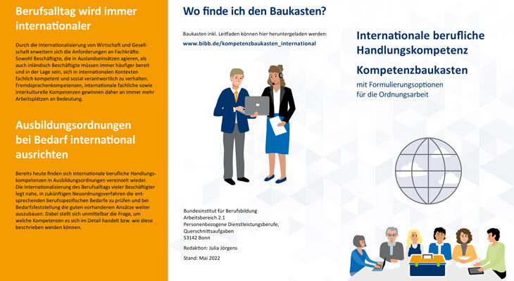 Die Internationalisierung von Wirtschaft und Gesellschaft steigert die Anforderungen an Fachkräfte: Fremdsprachen, Verständnis für andere Kulturen oder fachspezifische Fähigkeiten und Kenntnisse werden für die berufliche Tätigkeit wichtiger. In den Ausbildungsordnungen spiegelt sich dieser Sachverhalt bisher kaum. Als Unterstützungsangebot für die Ordnungsarbeit wurde ein Kompetenzbaukasten entwickelt.