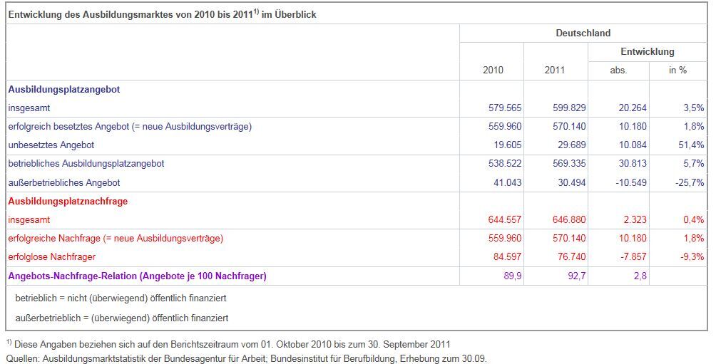 2011 wurden auf dem Ausbildungsmarkt 599.800 Ausbildungsplätze angeboten, 20.300 mehr als im Jahr zuvor). Insbesondere auf Seiten der Betriebe stieg das Angebot (+30.800), während die überwiegend öffentlich finanzierte außerbetriebliche Ausbildung zurückgefahren wurde (-10.500). Dem Angebot standen 646.900 Ausbildungsplatznachfrager gegenüber, 2.300 mehr als 2010. Da das Angebot deutlich stärker stieg als die Nachfrage, verbesserten sich die Ausbildungschancen der Jugendlichen; die Angebots-Nachfrage-Relation lag mit 92,7% um 2,8 Prozentpunkte höher als 2010. Insgesamt wurden 570.100 Ausbildungsverträge abgeschlossen (+10.200). Auf Seiten der Jugendlichen waren zum Ende des Berichtsjahres 2011 immer noch 76.700 auf Ausbildungsplatzsuche (7.900 weniger als ein Jahr zuvor); die Zahl der zu diesem Zeitpunkt noch unbesetzten Ausbildungsstellen stieg um 10.100 auf 29.700.