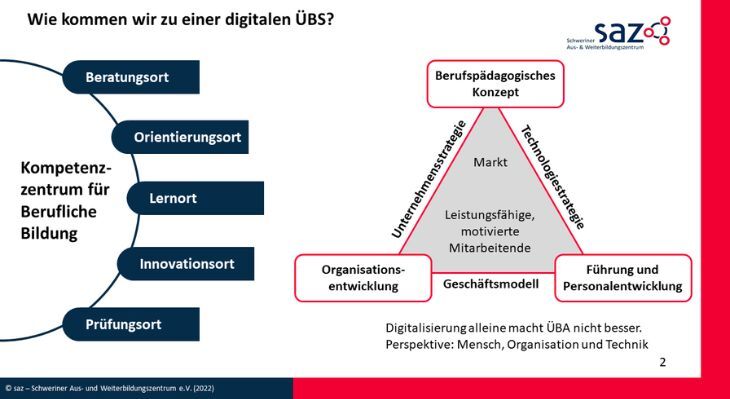 Die Diskussionsgrundlage bildeten Erfahrungsberichte aus der Projektarbeit. So erläuterte Ralf Marohn, Projektleiter von ProMech-I, den strategischen Ansatz zur Weiterentwicklung des saz-Schweriner Aus- und Weiterbildungszentrums e. V. Dabei stellte er die Grundüberlegungen zur Entwicklung einer digitalen ÜBS und ein hieraus abgeleitetes Modell zur Organisationsentwicklung vor (vgl. Abbildung 1).