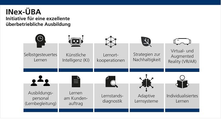 Mit der „Initiative für eine exzellente überbetriebliche Ausbildung (INex-ÜBA)“ werden überbetriebliche Berufsbildungsstätten (ÜBS) darin bestärkt, sich zu exzellenten Lehr- und Lernorten weiterzuentwickeln. Ziel ist es, die Qualität und Attraktivität der überbetrieblichen Ausbildung zu weiterzuentwickeln.