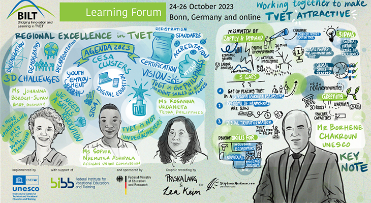 Das BIBB und das Internationale Zentrum für Berufsbildung der UNESCO (UNESCO-UNEVOC) richteten vom 24. bis 26. Oktober 2023 ihr BILT Learning Forum auf dem Campus der Vereinten Nationen in Bonn aus. Rund 100 Berufsbildungsexperten und -expertinnen aus Afrika, Asien-Pazifik und Europa nahmen vor Ort an der Veranstaltung teil; fast 400 Teilnehmende waren online zugeschaltet.
