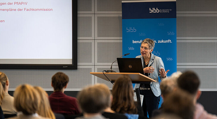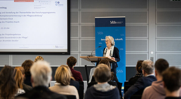 Zum Abschluss des Forschungsprojekts KoprA – Entwicklung (digital gestützter) kompetenzorientierter praktischer Abschlussprüfungen hatte das BIBB alle Projektbeteiligten sowie Akteure der Pflegeausbildung und -prüfung zu einer hybriden Tagung eingeladen. Mit dem Projekt wurde vom BIBB die Hochschule Bielefeld (HSBI) beauftragt. Nach einer Laufzeit von 18 Monaten fand nun die Abschlussveranstaltung in den Räumen des BIBB und online statt. Hieran nahmen insgesamt ca. 160 Personen teil. Sie wurde von Prof. Dr. Annette Nauerth, die eine Professur für biomedizinische Grundlagen der Pflege an der HSBI innehatte und das Forschungsprojekt leitet, moderiert.