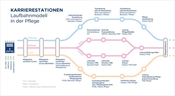 Laufbahnmodelle haben das Ziel, die fachliche Expertise sowie die Ausbildungsqualität im Pflegedienst zu stärken. Gleichzeitig sollen den Mitarbeitenden vielfältige Karrieremöglichkeiten entsprechend ihrer persönlichen Ziele aufgezeigt werden. Neben den klassischen Karrierepfaden in der Pflegepädagogik und im Management, eröffnen Laufbahnmodelle für den fachlichen Bereich die Möglichkeit, HQP hinsichtlich Ihrer fachlichen Expertise weiterzuentwickeln. Neben HQP stehen auch beruflich ausgebildeten Pflegefachpersonen verschiedene Weiterbildungsmöglichkeiten offen.