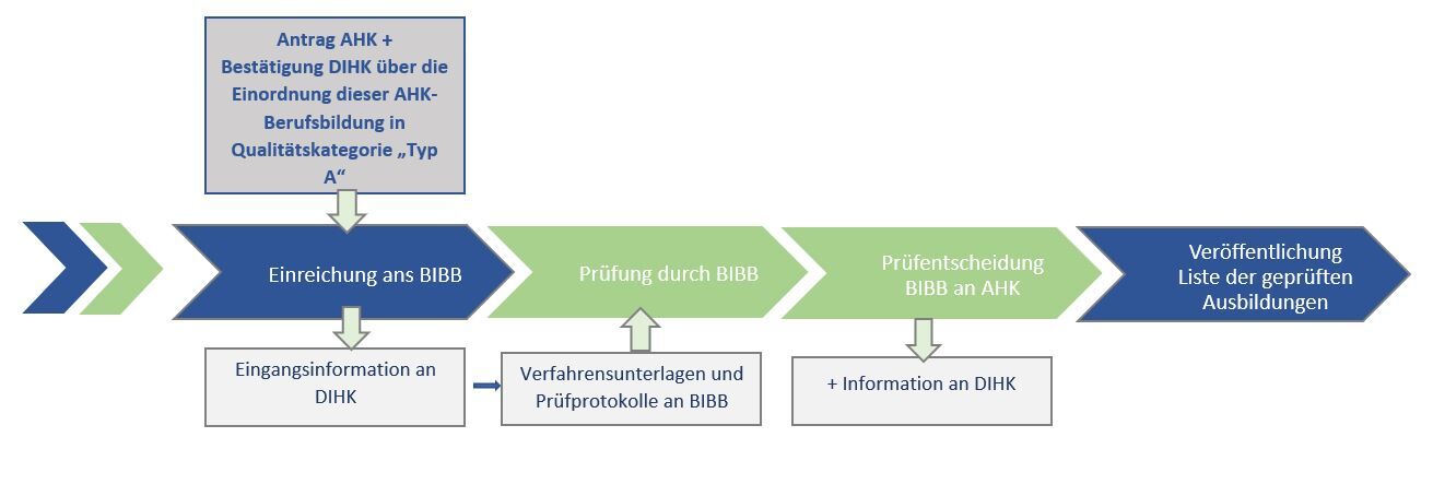 AHK können Anträge auf Bestätigung, dass ihre Berufsabschlüsse (Typ A) nach Inhalt, Dauer und der Art ihrer Durchführung die Anforderungen des Berufsbildungsgesetzes (BBiG) an eine Berufsausbildung einhalten und geeignet sind, die notwendige berufliche Handlungsfähigkeit für einen Ausbildungsberuf nach dem BBiG oder der Handwerksordnung (HwO) zu vermitteln, unter VET-check(at)bibb.de stellen.