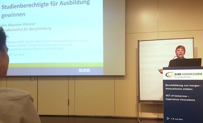BIBB-Expertin Kim-Maureen Wiesner legte im Rahmen des BIBB-Kongresses am 7. und 8. Juni in Berlin dar, wie Betriebe ihre Chancen verbessern können, um Studienberechtigte für eine duale Ausbildung zu gewinnen.