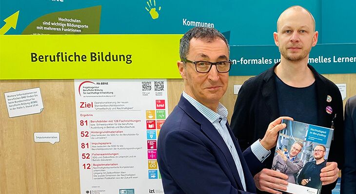 Bundesminister Cem Özdemir gemeinsam mit BBNE-Teamleiter Moritz Ansmann am Stand des BMBF auf der didacta 2025. Sie präsentieren die Broschüre „Nachhaltigkeit in der Berufsbildung“, die in 5 Praxisbeispielen die Bedeutung beruflicher Bildung für nachhaltige Entwicklung (BBNE) konkret sichtbar macht.