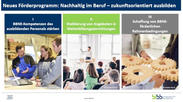Mit der aktuellen Förderrichtlinie des Programms „Nachhaltig im Beruf – zukunftsorientiert ausbilden (NIB)“ stellt das BMBF Fördermittel zur Entwicklung, Erprobung und Umsetzung entsprechender Berufsbildungsmaßnahmen bereit. Das BIBB betreut das Programm fachlich.