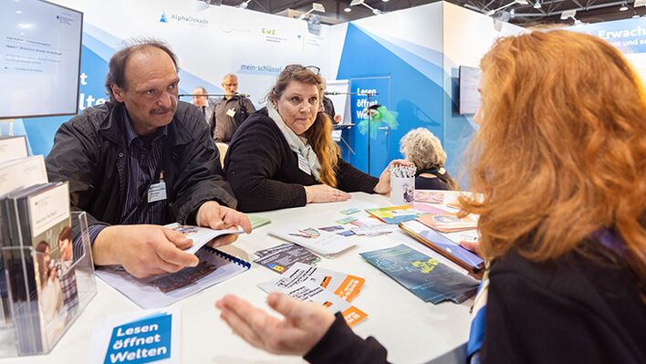 Nach dreijähriger Corona-Pause präsentierte sich die AlphaDekade wieder auf der Leipziger Buchmesse. Am Stand konnten die Besucherinnen und Besucher eine Vielzahl von spannenden Programmpunkten erleben und sich über Alphabetisierung und Grundbildung informieren.
