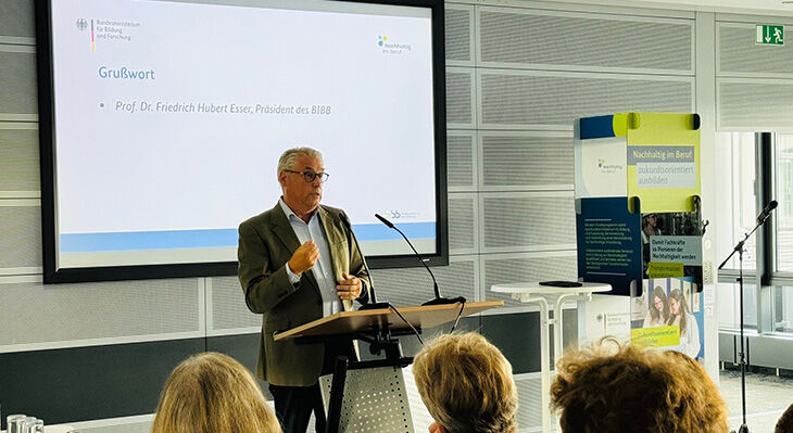 Mit einer Auftaktkonferenz wurde am 12. Januar die neue Förderperiode des Europäischen Sozialfonds (ESF) eingeläutet. Moritz Ansmann hat dort das neue Förderprogramm „Nachhaltig im Beruf“ vorgestellt, welches das BIBB im Auftrag des BMBF fachlich begleitet. In Kürze erscheint der erste Förderaufruf.