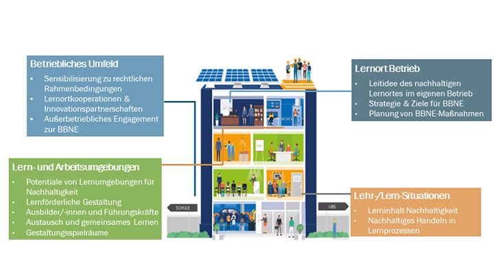 Nachhaltigkeit lässt sich besonders gut lernen, wenn sie am Lernort sichtbar und erlebbar ist. Betriebe werden zu nachhaltige(re)n Lernorten, wenn sie Nachhaltigkeit ganzheitlich in Strukturen, Prozesse und Kultur integrieren.
