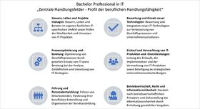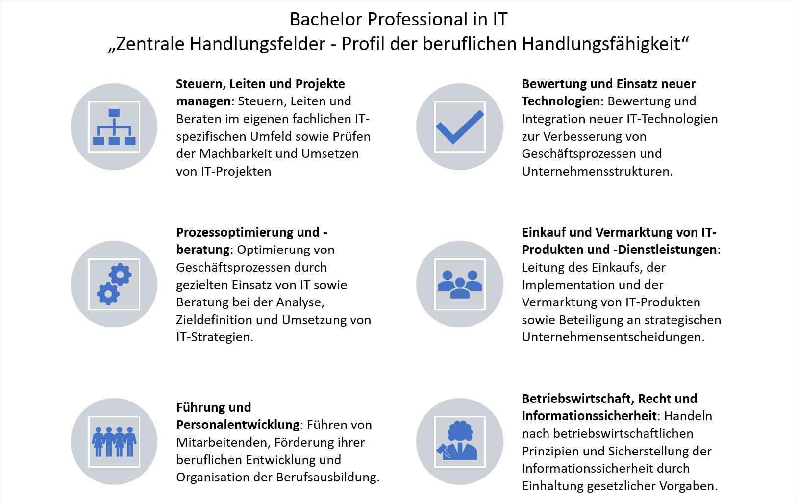Der Abschluss zum Bachelor Professional in IT bildet das Kernstück des neuen IT-WBS. Er qualifiziert für anspruchsvolle Fach- und Führungspositionen und bietet eine breite Auswahl an Spezialisierungsoptionen in verschiedenen IT-spezifischen Domänen, die denen der Berufsspezialisten entsprechen. Zudem beinhaltet er Bereiche wie Mitarbeiterführung, Projekt- und Prozessmanagement, betriebswirtschaftliches Handeln und Sicherheit in der Informationstechnik. Für eine detaillierte Übersicht zum Profil der beruflichen Handlungsfähigkeit des Bachelor Professionals-Profils, siehe die Abbildung.