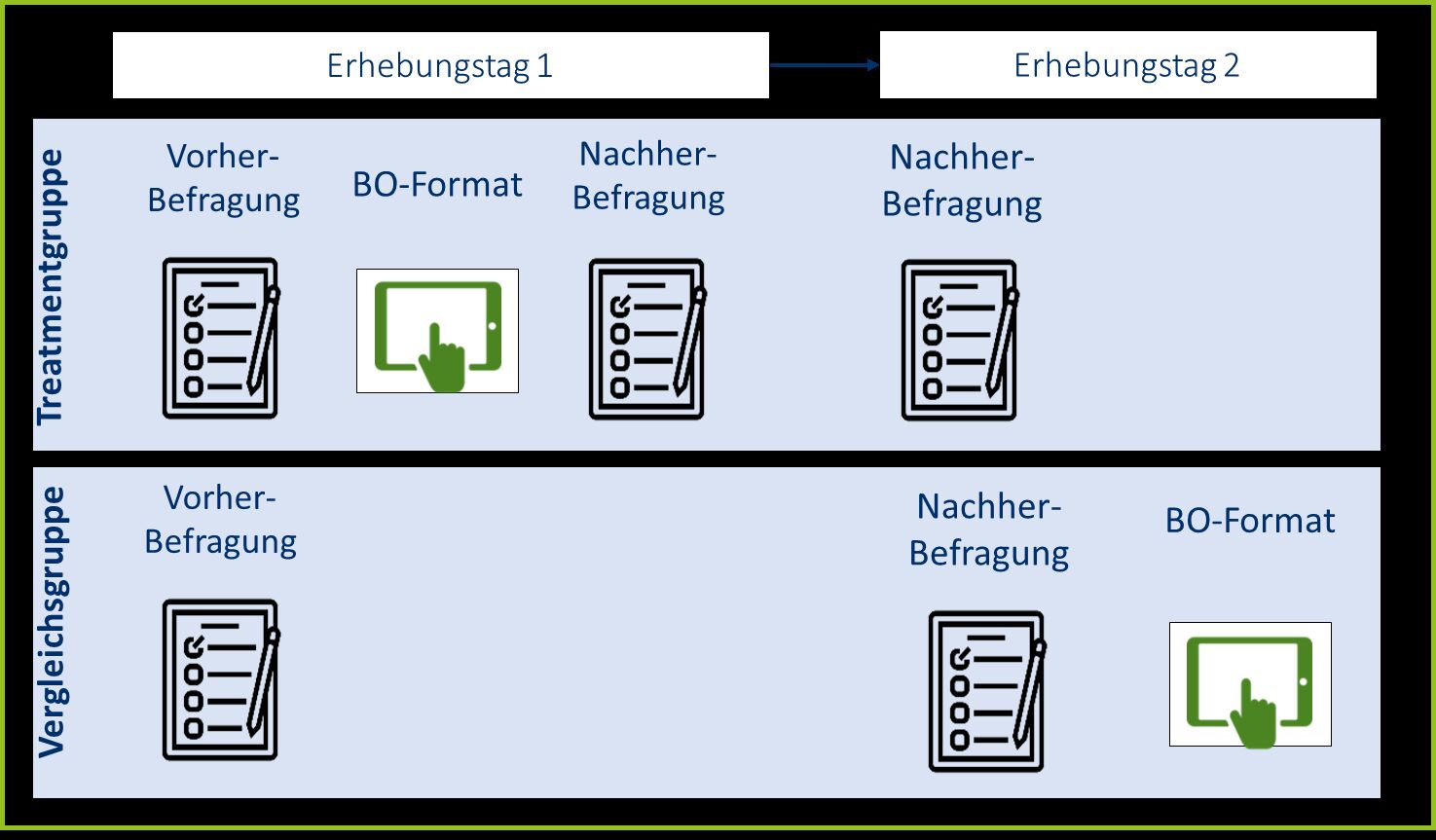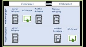 Ein zentrales Ziel des Forschungsprojekts ist zu untersuchen, wie das BO-Format Schülerinnen und Schüler in ihrem Berufsorientierungsprozess unterstützen kann. Dazu wird eine quasi-experimentelle Interventionsstudie durchgeführt. Mit dem Forschungsdesign soll auch dem Mangel an BO-Ansätzen, welche robuste Aussagen zu deren Wirksamkeit zulassen (z.B. Whiston et al., 2017), abgeholfen werden.