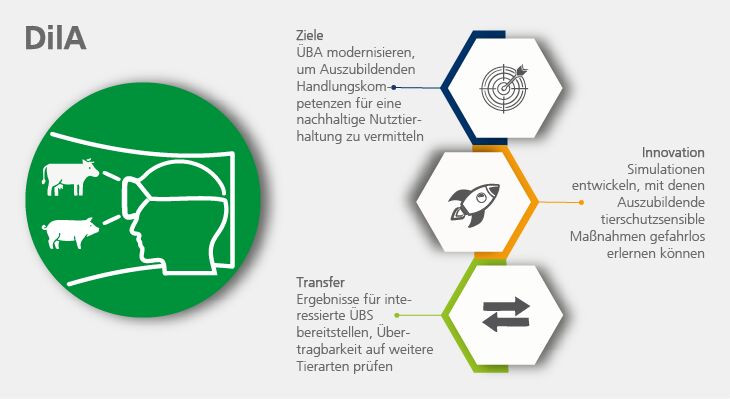 Mit „DilA“ zielen das Versuchs- und Bildungszentrum Landwirtschaft Haus Düsse und das Bildungs- und Wissenszentrum Boxberg darauf ab, die überbetriebliche landwirtschaftliche Ausbildung didaktisch und technologisch zu modernisieren. Angehende Landwirtinnen und Landwirte sollen so den neuen Anforderungen an Tier- und Umweltschutz begegnen können.