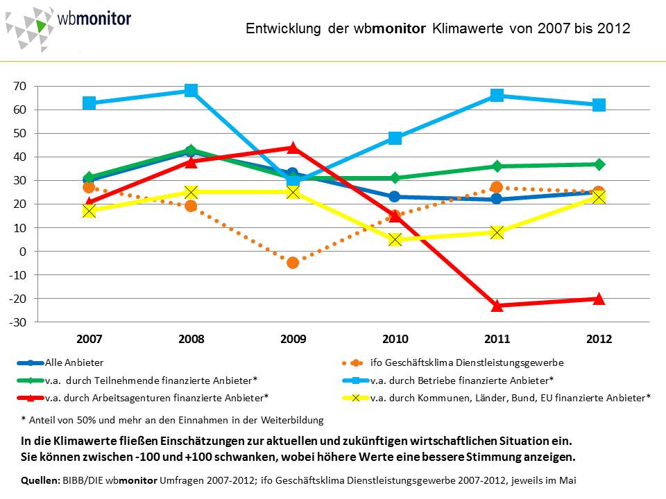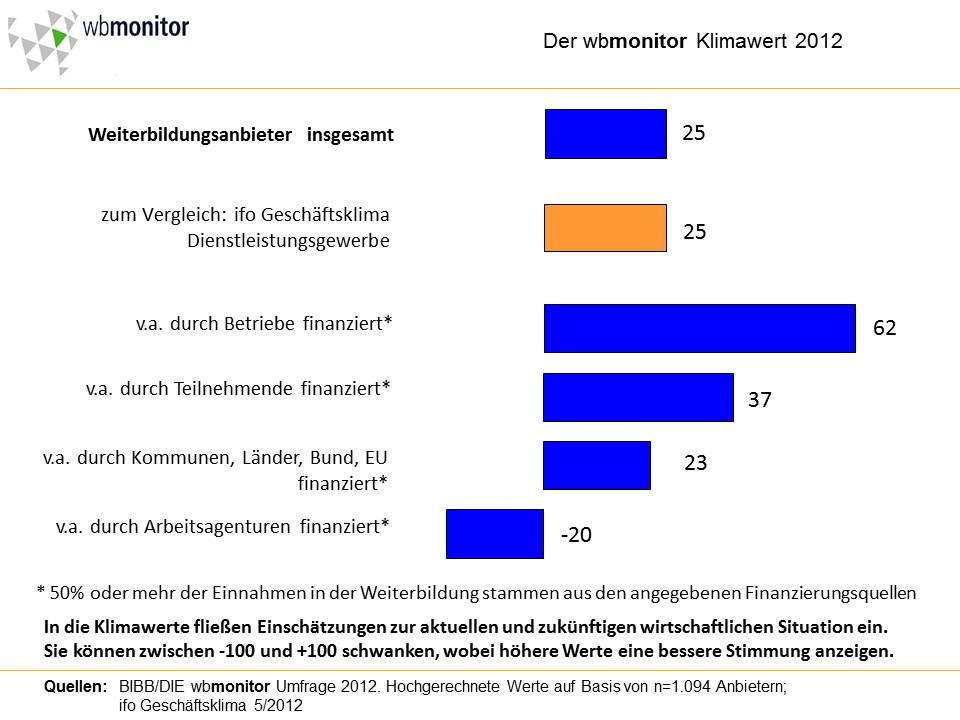 Der wbmonitor Klimawert für die gesamte Weiterbildungsbranche ist mit +25 stabil und auf dem Niveau der beiden Vorjahre. Die Polarität des Wirtschaftsklimas zwischen überwiegend betrieblich und überwiegend Arbeitsagentur finanzierten Anbietern bleibt 2012 bestehen: Während erstere Anbietergruppe von weiterhin hervorragenden Geschäftsbedingungen berichtet (+62), befindet sich die wirtschaftliche Stimmung der Arbeitsagentur finanzierten Anbieter auch 2012 im Tief (-20).