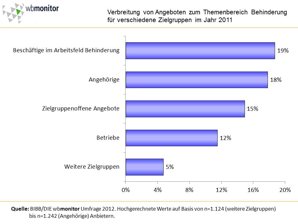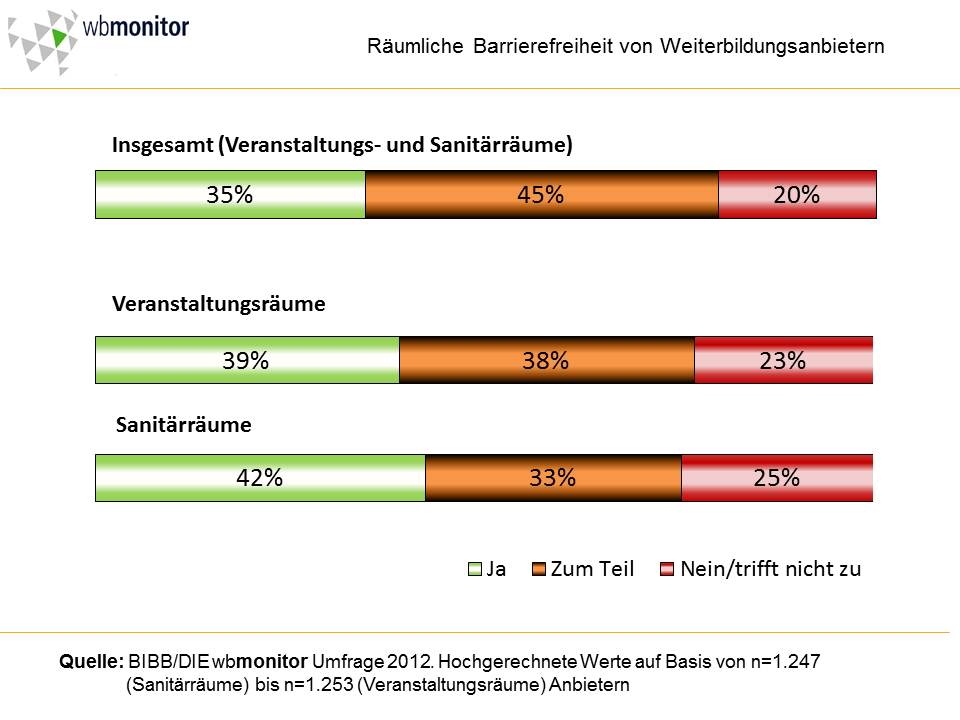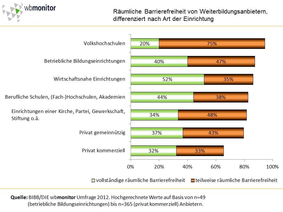 Zusätzlich wurden mit dem wbmonitor 2012 erstmals repräsentative Daten aus Anbietersicht zu dem bildungs- und sozialpolitisch relevanten Thema ,Weiterbildung und Behinderung' gewonnen. Die Ergebnisse zeigen, dass noch erhebliche Anstrengungen zur Verwirklichung des Anspruchs erforderlich sind, inklusive Bildung für alle anzubieten.