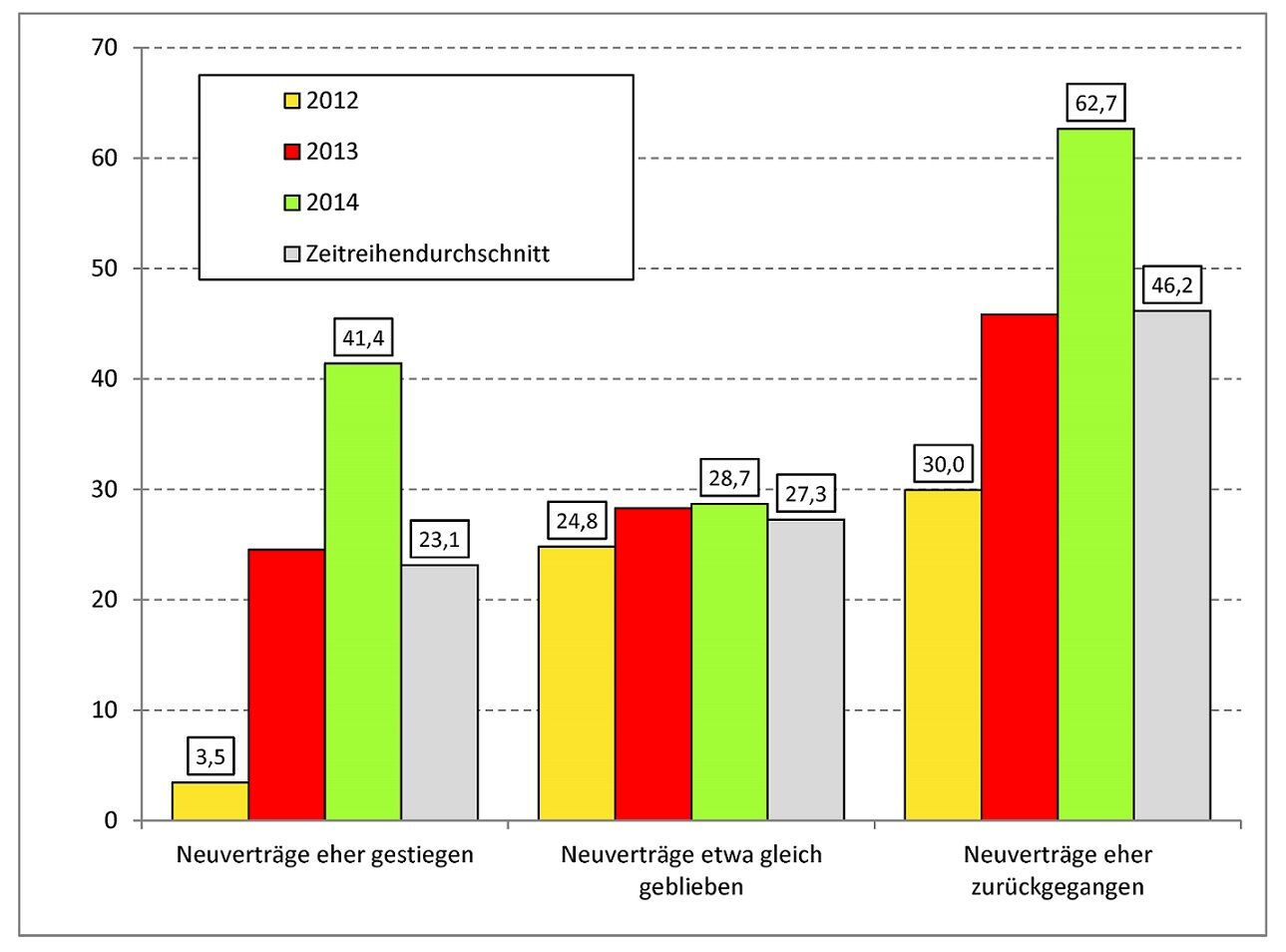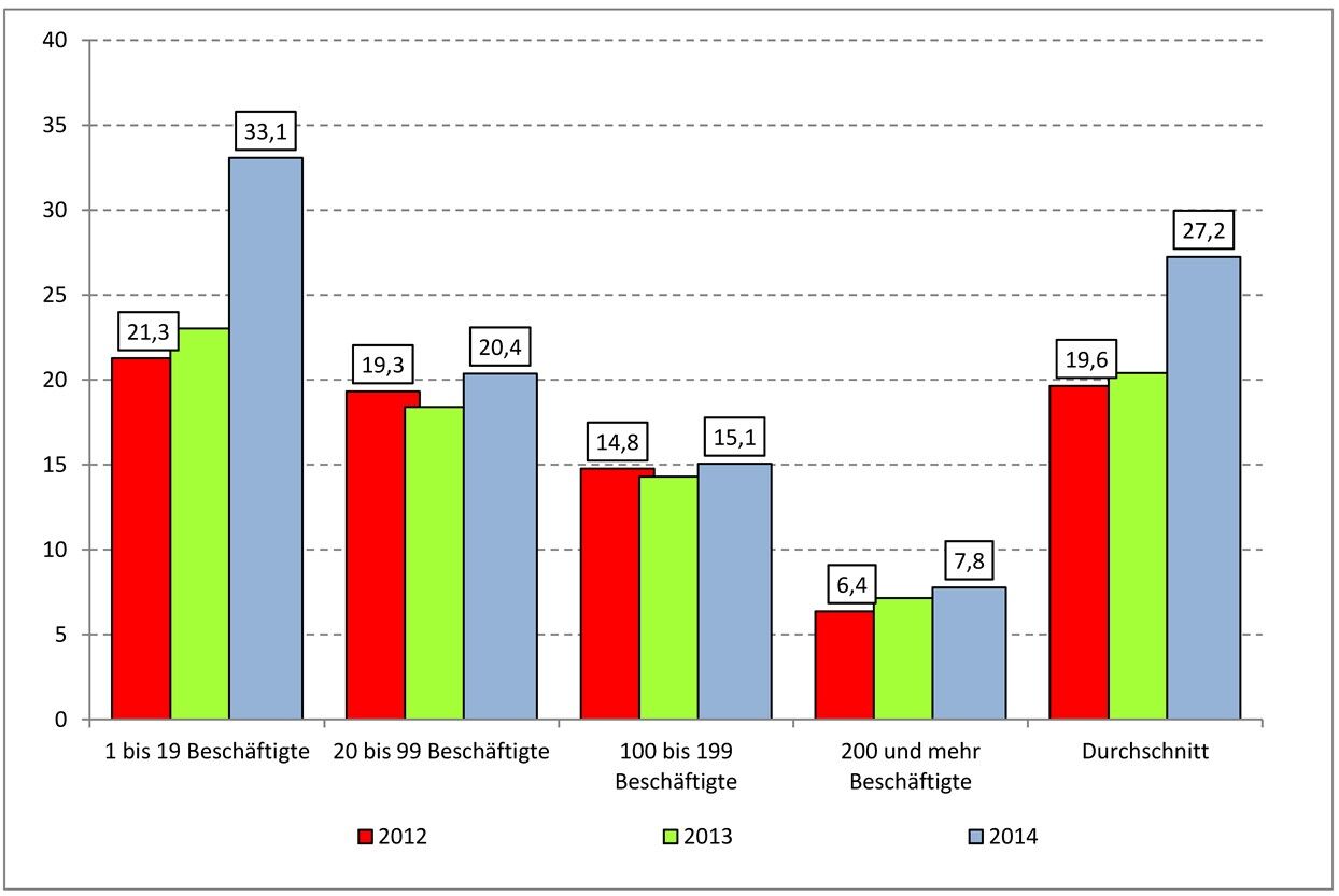 Allerdings hat der Anteil an unbesetzten Ausbildungsstellen auch in Betrieben mit gestiegenen Neuvertragszahlen zwischen 2012 und 2014 deutlich zugenommen und sich in Betrieben mit relativ konstanter Ausbildungsbeteiligung auf höherem Niveau stabilisiert. In Betrieben mit rückläufigen Ausbildungsvertragszahlen seit 2012 ist der Anteil unbesetzter Ausbildungsstellen bis zum Jahr 2014 dagegen sprunghaft angestiegen, nur als erneute und misslungene Versuche zur Besetzung von Ausbildungsstellen oder als Rückgang im Ausbildungsstellenangebot interpretierbar.