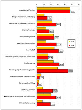 Auch nach Wirtschaftsbereichen ergeben sich für ausbildende Betriebe und Unternehmen sehr unterschiedliche Ausgangsvoraussetzungen bei der Suche nach geeigneten Ausbildungsstellenbewerberinnen und -bewerbern (vgl. Abbildung 2). Besonders betroffen von der vergeblichen Bewerbersuche im Jahr 2014 sind der Bereich Landwirtschaft/Bergbau, das Beherbergungs- und Gastronomiegewerbe, aber auch die Bauwirtschaft und der Einzelhandel. Hier liegen die Anteile unbesetzter Ausbildungsstellen durchschnittlich zwischen 30 % und 47 %. In den meisten dieser Bereiche kommt es auch im Vorjahresvergleich zu weiteren Verschlechterungen bei der Besetzung der Ausbildungsstellen.