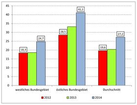 Die unterschiedliche Ausgangssituation scheint sich auch nicht grundlegend zu ändern, obwohl es bis zum Jahr 2014 zu einem gestiegenen Anteil an Vakanzen bei westdeutschen Ausbildungsbetrieben auf 24,7 % gekommen ist. Im Osten wird im Vergleich dazu ein Anteil von 41,1 % erreicht. Damit beträgt der Unterschied zwischen Ost und West im Berichtsjahr schon 16,4 Prozentpunkte. Es ist davon auszugehen, dass die zunehmenden Anteile bei den unbesetzten Ausbildungsstellen bei ostdeutschen Ausbildungsbetrieben letztendlich Konsequenzen einer über schon längere Zeit vergeblichen Suche nach Auszubildenden ist.