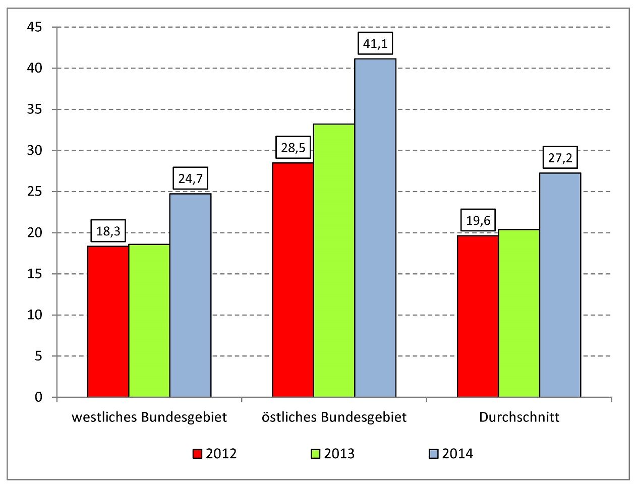 Im Durchschnitt bleibt im Ausbildungsjahr 2013/2014 mit 27,2 % gut jede vierte angebotene Ausbildungsstelle vakant (vgl. Abbildung 1). Zwei Jahre zuvor war es mit 19,6 % nur jede fünfte Ausbildungsstelle.