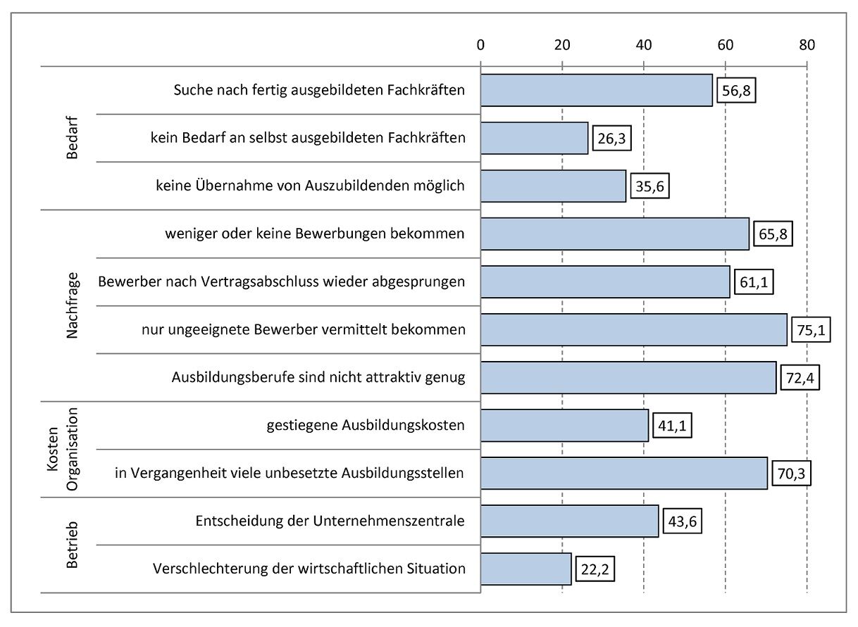 Die Ausbildungsbetriebe, die in den letzten drei Jahren Rückgänge in der Zahl an neu abgeschlosse-nen Ausbildungsverträgen verzeichneten (vgl. Abbildung 4), wurden in der vierten Erhebungswelle des BIBB-Qualifizierungspanels im Jahr 2014 gefragt, aus welchen Gründen sie weniger Ausbildungsverträge abgeschlossen haben oder abschließen konnten.4 Die naheliegende Vermutung ist, dass der wachsende Bestand an unbesetzten Ausbildungsstellen und die vergebliche Bewerbersuche mit die wichtigsten Gründe für Rückgänge in der betrieblichen Ausbildungsbeteiligung sind.