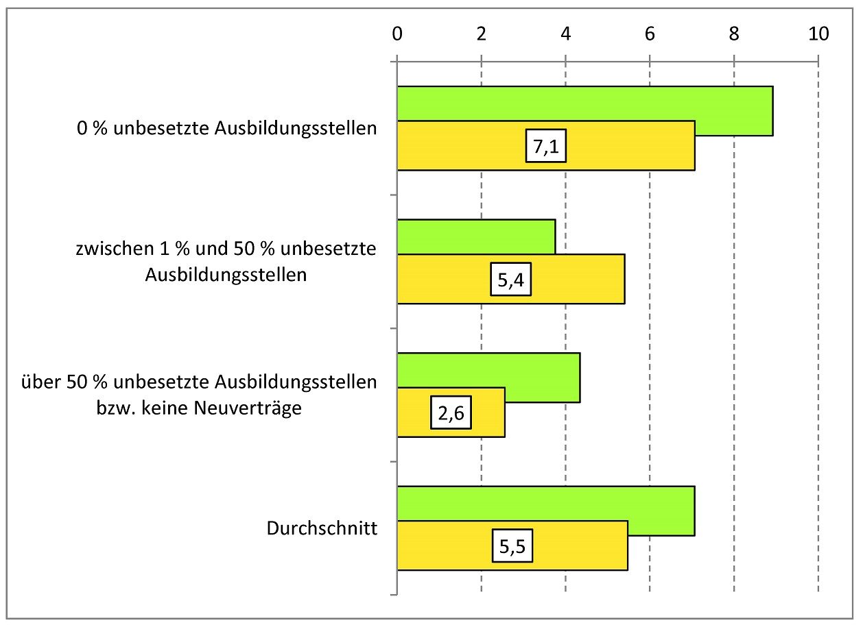 Wenn Betriebe ihre Ausbildungsstellen vollständig besetzen konnten, dann kamen für das Ausbildungsjahr 2013/2014 sieben Bewerbungen von Schulabsolventen auf eine angebotene Ausbildungsstelle. Wenn Betriebe einen Anteil an unbesetzten Ausbildungsstellen von über 50 % aufweisen oder gar keine Auszubildenden finden konnten, dann waren dies durchschnittlich nur knapp drei Bewerbungen pro Ausbildungsstelle. Dazwischen liegen Betriebe, die im Durchschnitt bis zur Hälfte ihrer Ausbildungsangebote keine Auszubildenden gefunden haben, obwohl die Zahl der Bewerberinnen und Bewerber mit durchschnittlich über fünf Bewerbungen ausreichend hoch für genügend Auswahlwahlmöglichkeiten erscheint. Im Durchschnitt aller Ausbildungsbetriebe reichen 5 Jugendliche ihre Bewerbung bei Betrieben ein.