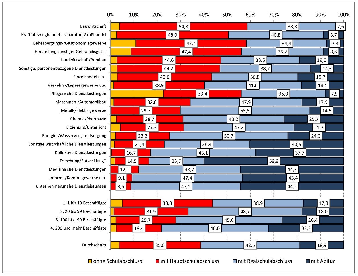 Im Durchschnitt liegt der Anteil der Bewerbungen von Hauptschulabsolventen mit 35 % unter denjenigen von Realschulabsolventen, die auf einen durchschnittlichen Anteil von 42,5 % kommen. Schulabsolventen mit Fach- oder Hochschulreife reichen nach Angaben der befragten Betriebe zu 18,9 % Bewerbungen bei Betrieben ein.
