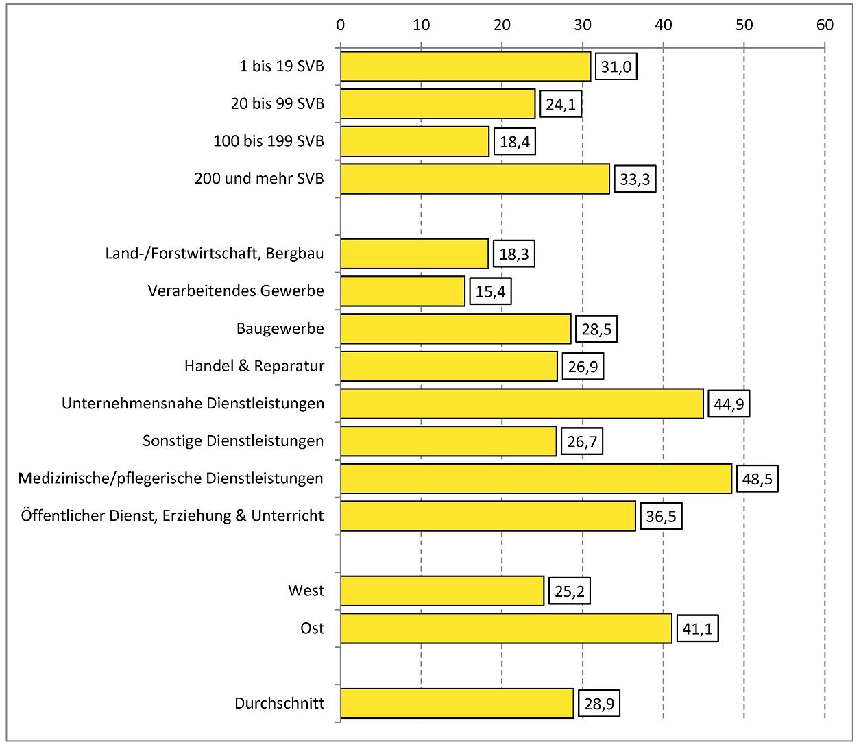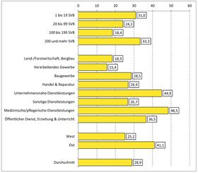 Der durchschnittliche Anteil vorzeitig gelöster Ausbildungsverträge an den unbesetzten Ausbildungsstellen beträgt 28,9 %. Besonders hoch fällt dieser Anteil in ausbildenden Kleinstbetrieben und in Großbetrieben aus. Beide Betriebsgrößenklassen erreichen Zahlenwerte von über 30 %. Bei den kleinen und großen mittelständischen Ausbildungsbetrieben liegt der Anteil zwischen 18 % und 24%. Nach Wirtschaftsbereichen liegen pflegerische und medizinische Dienstleistungen sowie unternehmensnahe Dienstleistungen mit 48,5 % bzw. 44,9 % weit über dem Durchschnitt. Auffallend sind die niedrigen Werte im verarbeitenden Gewerbe, die auf einen Anteil an vorzeitigen Vertragslösungen in Höhe von 15,4 % kommen. Wie in anderen Un-tersuchungsbereichen liegen die Lösungsanteile bei ostdeutschen Ausbildungsbetrieben mit 41,1 % mit am höchsten.