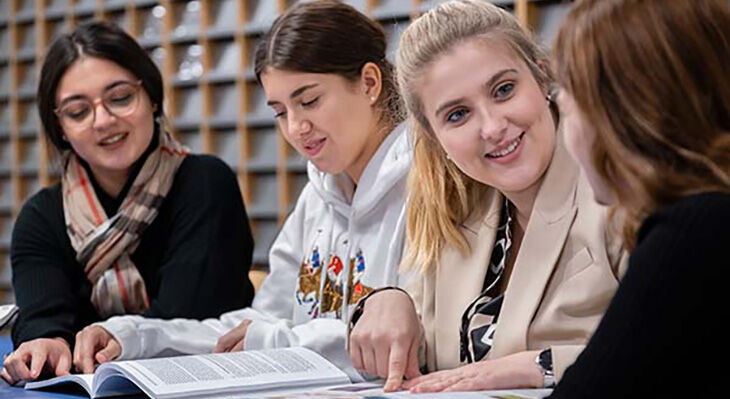 Eine Gruppe jungerLeute sitzt an einem Konferenztisch und nehmen an einer Besprechung teil.